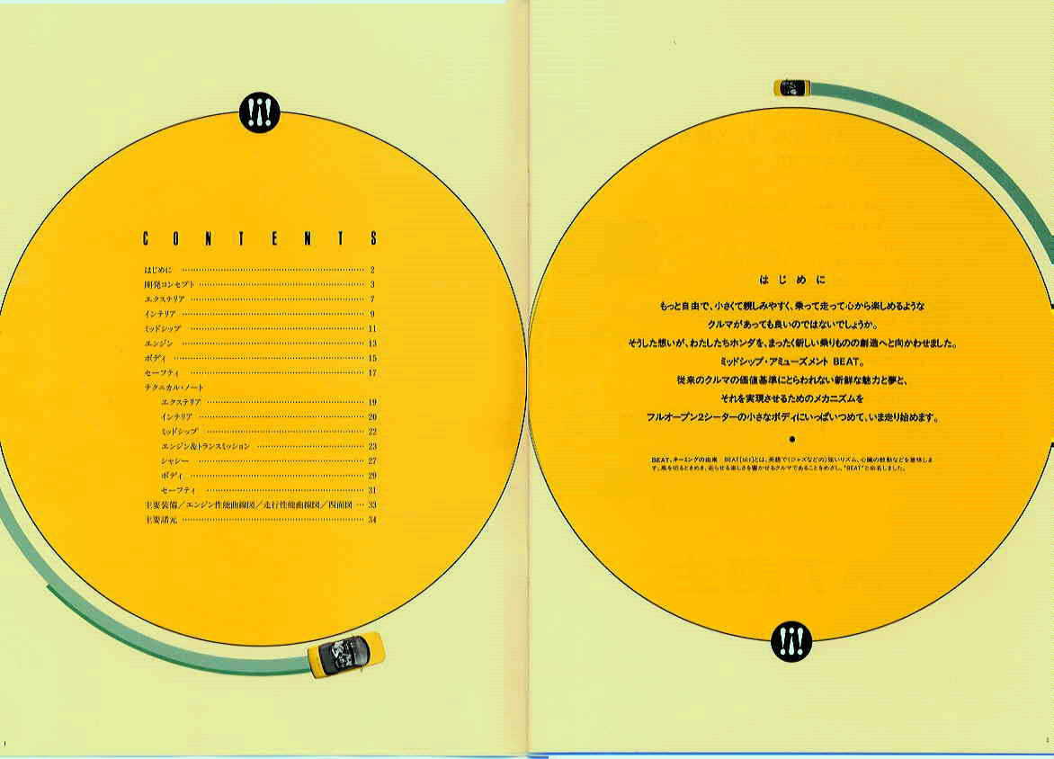 「目次」と「はじめに」です。BEAT、ネーミングの由来には英語でジャズなどの強いリズム、心臓の鼓動などを意味し、風を切るときめき、走らせる楽しさを響かせるクルマであることを目指し、命名したとあります。 |