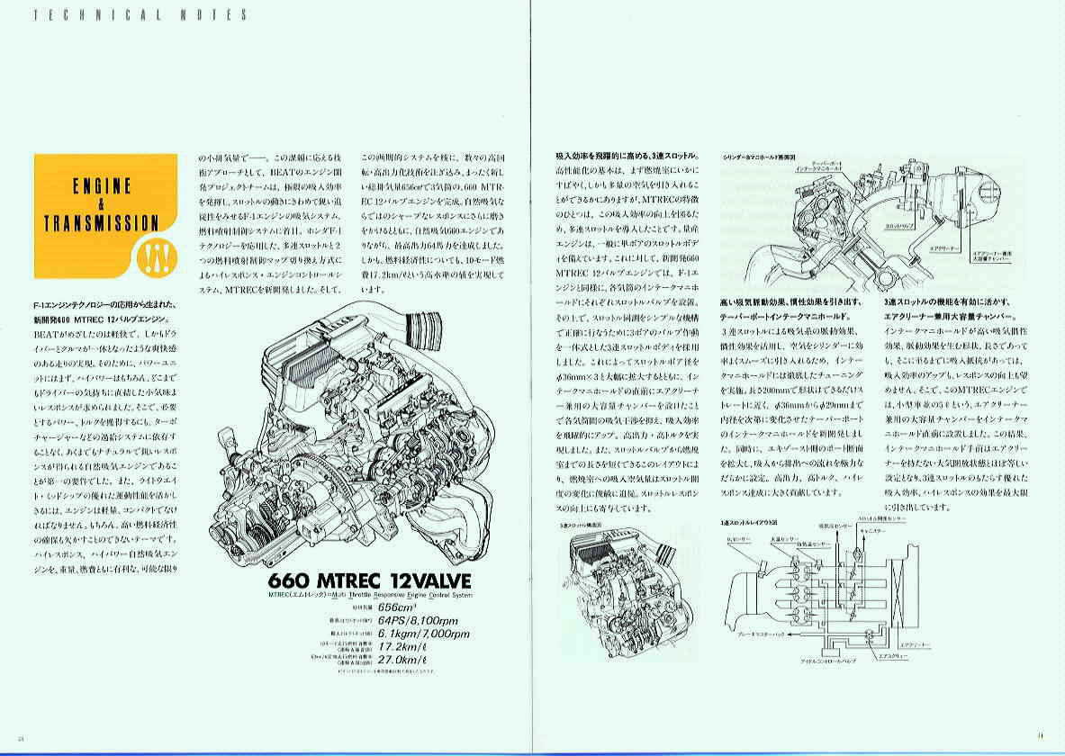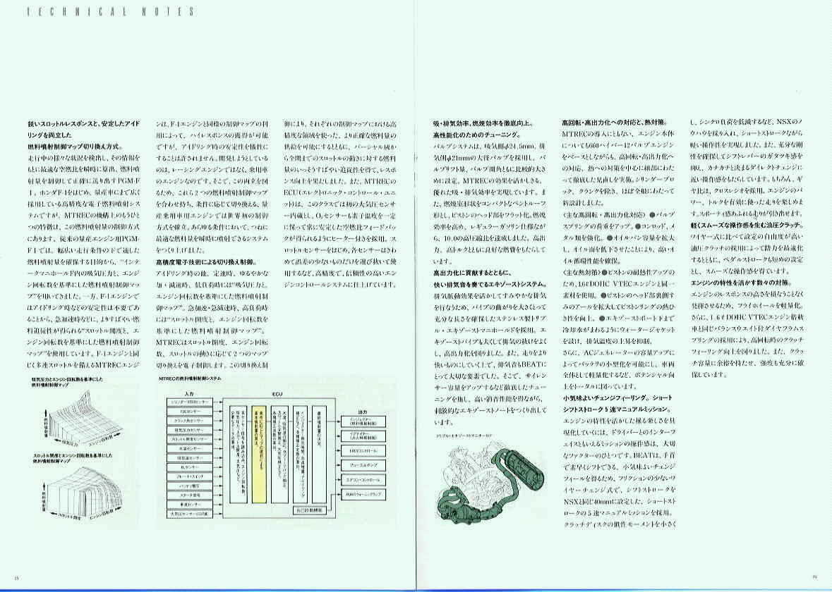 エンジンの説明部分。さすが、エンジンのホンダ!ページ割いてます!って感じ。多くのホンダ車がエンジンを載せる入れ物として車体も仕方なく作ってますと言う感じを抱かせる理由がここにあります。 |