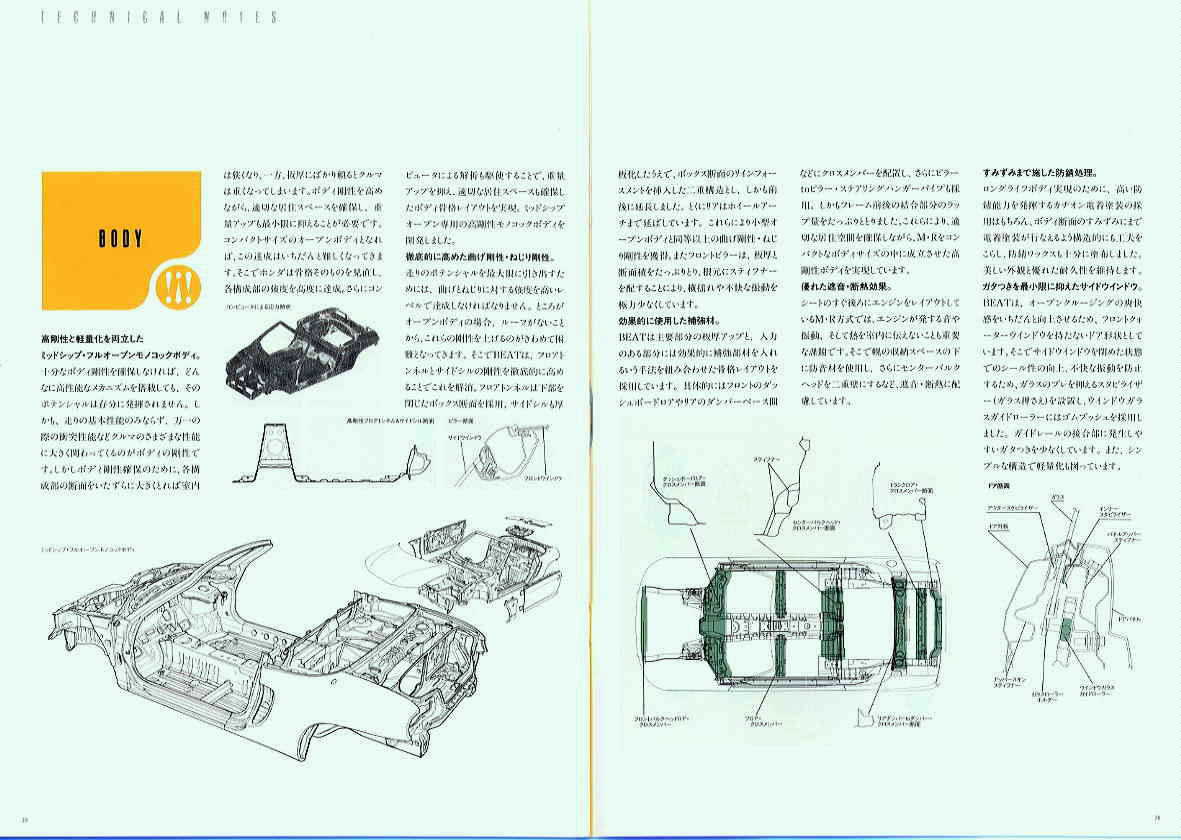 ミッドシップの説明部分。私にとって大発見だったのは、燃料タンクの位置が明らかになったという点。また、あまりに少ないタンク容量の理由も自ずと明らかになった。これでは灯油ポリタンクを背中に背負ってるのと変わらない訳だ。 |