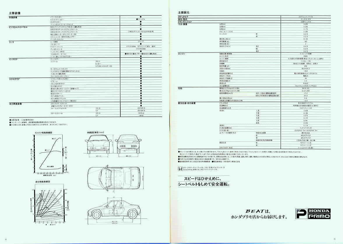 スペック表です。そう言えばホンダ車には必ずドアの内張りに、「ロックしましょう」と書かれたシールが貼ってあったものですが、ビートには無い様です。あの伝統はまだ続いているのでしょうか?勿論このスペック表には全く関係ない話ですが。 |