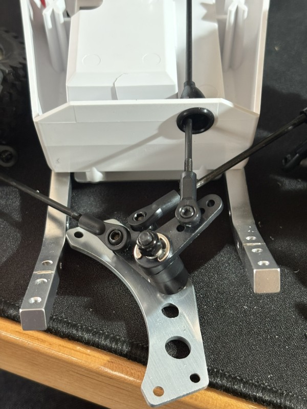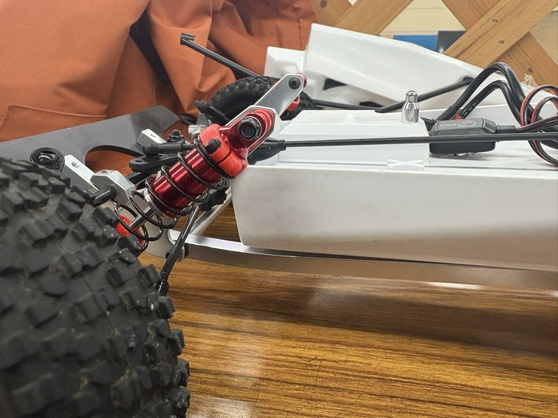 回収して状態を確認すると、フロントダンパーの取り付け角度が左右でずれており、サーボはセンター位置なのにタイヤはあらぬ方向を向いたまま、よくよく見れば、アルミ製のラダーフレームが波打ってしまっている。