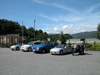 白樺湖近くのお蕎麦屋にて、全車集合の記念撮影。